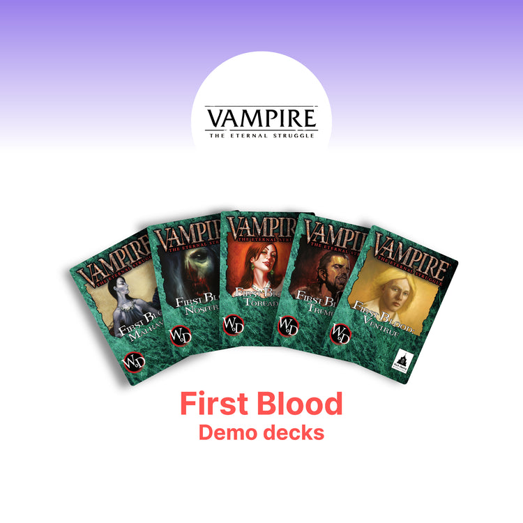 First Blood es una colección de cinco mazos preconstruidos de 55 cartas diseñados para enseñar a jugar a Vampire: The Eternal Struggle. Estos mazos son más sencillos que los mazos de nivel de torneo, pero muestran todas las mecánicas básicas del juego. Están equilibrados entre sí, y ofrecen una primera experiencia de juego divertida y emocionante. Son cartas completamente funcionales, listas para mezclarse con cartas de otras expansiones.